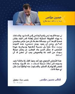 رئيس حركة حقوق النائب حسين مؤنس: عودة الارهابي رافع الرفاعي تمثل اهانة للبلد ولكل ضحايا الارهاب
