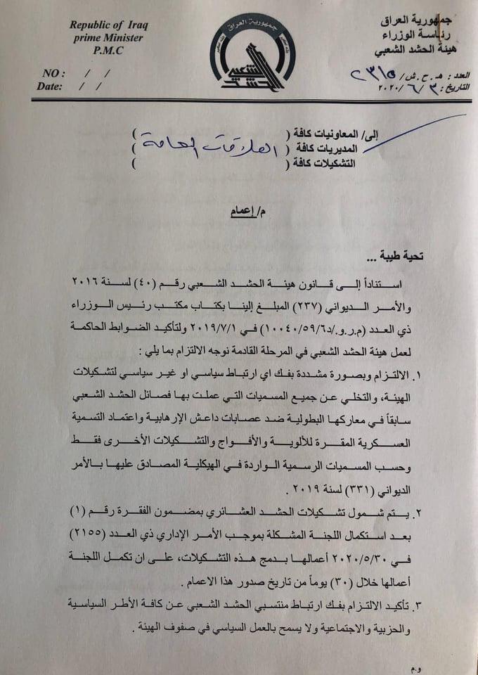 اصدر رئيس هيئة الحشد الشعبي فالح الفياض، الاربعاء، 10 قرارات بشأن عمل الهيئة في المرحلة القادمة.