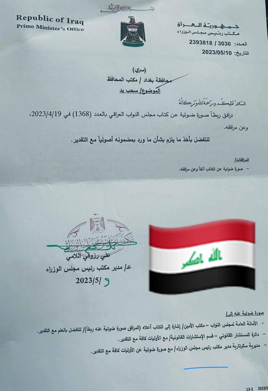 بالوثيقة.. كتاب حكومي إلى محافظة بغداد بشأن "سحب يد" نائب محافظ بغداد