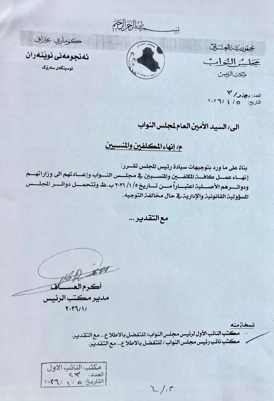 بالوثيقة..إنهاء المكلفين والمنسبين في مجلس النواب وإعادتهم إلى وزارتهم ودوائرهم الأصلية.