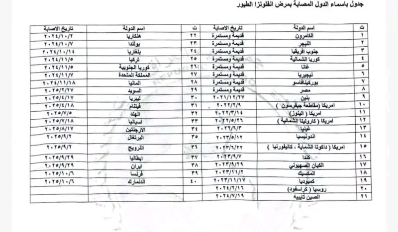 أعلنت السلطات الصحية، اليوم الأربعاء (15 تشرين الأول 2025)، عن منع استيراد الدواجن والبيض والمنتجات المرتبطة بها من 40 دولة، بسبب تفشي مرض إنفلونزا الطيور في تلك الدول.