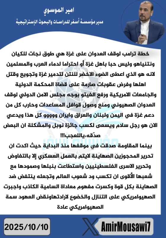 وقال الموسوي في تدوينة نشرها على حسابه الرسمي في منصة "إكس" إن "خطة ترامب لوقف العدوان على غزة هي طوق نجاة للكيان ونتنياهو، وليست خطوة إنسانية كما يحاول تصويرها، لأنه هو من منح الضوء الأخضر لتدمير غزة وتجويع وقتل أهلها"، داعيًا إلى "فرض عقوبات صارمة على قادة الاحتلال ومحاكمتهم أمام القضاء الدولي".