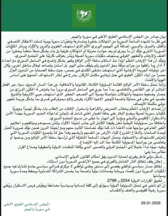 بيان صادر عن المجلس الإسلامي العلوي الأعلى في سوريا والمهجر