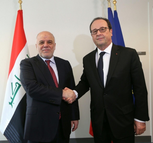 وأبدى هولاند بحسب بيان لمكتب العبادي "دعم بلاده للعراق في حربه ضد الارهاب واستعداد فرنسا لتقديم جميع المساعدات" مشيرا الى ان "الامور في العراق تسير بوضع صحيح ومطمئن ونحن مع سيادة واستقرار العراق وعدم التدخل بشؤونه الداخلية".