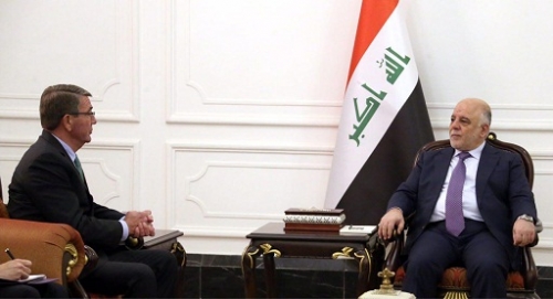 وذكر بيان لرئاسة الوزراء ان "رئيس مجلس الوزراء حيدر العبادي استقبل في مكتبه وزير الدفاع الامريكي اشتون كارتر والوفد المرافق له وجرت خلال الاجتماع مناقشة سير عمليات قادمون يا نينوى والانتصارات التي تحققها قواتنا البطلة في المعركة واعادة الاستقرار للمناطق المحررة وتدريب وتسليح القوات العراقية".