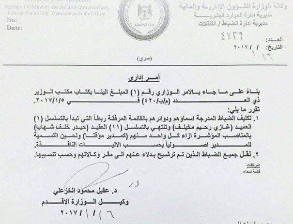 ونشرت وسائل الاعلام وثيقة صادرة عن الوكيل الاقدم لوزارة الداخلية ، عقيل الخزعلي ، تقضي باستبدال 11 ضابطاً في قيادة شرطة محافظة البصرة بكافة مفاصلها.