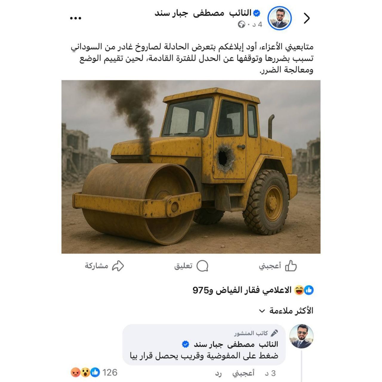 ونشر النائب سند في صفحته الشخصية على الفيسبوك بيانا اطلعت عليه وكالة انباء براثا ( متابعيني الاعزاء اود ان ابلغكم بتعرض الحادلة لصاروخ غادر من السوداني تسبب بضررها وتوقفها عن الحدل للمرحلة القادمة لحين تقييم الوضع ومعالجة الضرر )
