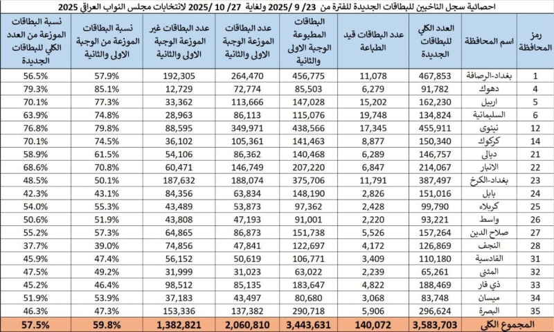 وبحسب الجدول " فأن نسبة البطاقات الموزعة من العدد الكلي للبطاقات الجديدة قد بلغت 57.5%، أما عدد البطاقات الجديدة الكلي بلغ 3.583.703 بطاقة: