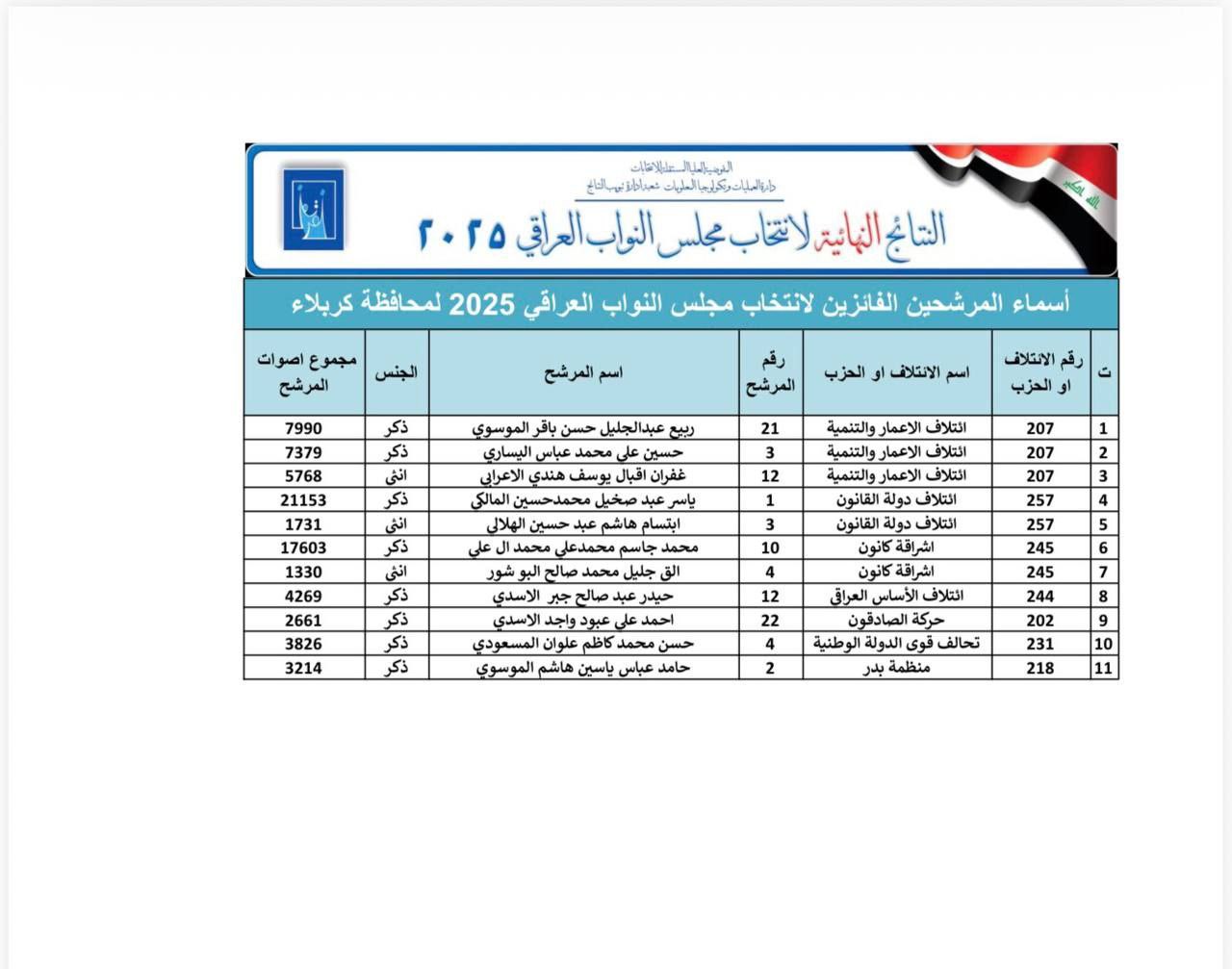اسماء الفائزين في الانتخابات البرلمانية بمحافظة كربلاء المقدسة