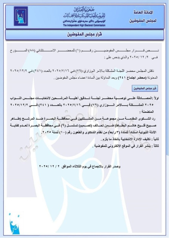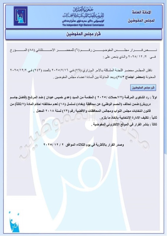 أصدرت مفوضية الانتخابات، اليوم الثلاثاء، ( 2 كانون الأول 2025 )، جملة من القرارات الجديدة.