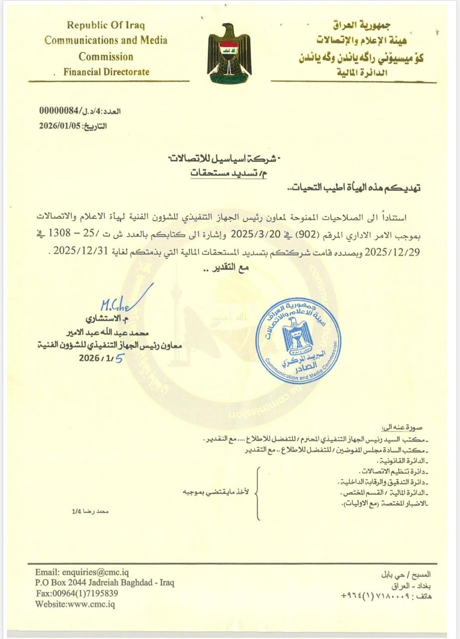 وتقدمت آسياسيل "بالشكر والتقدير إلى هيئة الإعلام والاتصالات على تعاونها المهني ودورها التنظيمي، بما يسهم في تعزيز الاستقرار ودعم بيئة عمل مؤاتیة مستدامة لقطاع الاتصالات في العراق"، مجددة "التزامها بدورها كشريك وطني مسؤول، يفي بجميع التزاماته ويواصل الاستثمار في تطوير قطاع الاتصالات وتقديم أفضل الخدمات للمواطنين".