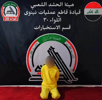 وذكر بيان لاعلام الحشد ان "مفارز قسم استخبارات اللواء 30 ضمن قيادة عمليات نينوى للحشد الشعبي، ألقت القبض على أحد الإرهابيين المطلوبين عند أحد مداخل سهل نينوى، استناداً إلى معلومات استخبارية دقيقة".