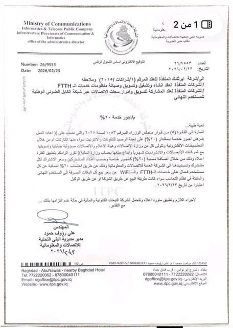 وذكرت وثيقة صادرة عن مديرية البنى التحتية للاتصالات والمعلوماتية، موجهة إلى شركة إيرثلنك والشركات المنفذة لعقود (FTTH) والخدمات الضوئية، تلقتها "بغداد اليوم"، أنه "إشارة إلى الفقرة (5) من قرار مجلس الوزراء المرقم 1083 لسنة 2025، والتي نصت على إعادة العمل بفرض أجور خدمة بمقدار 20% على تعبئة الرصيد للتلفونات والإنترنت، سواء منها الكارتات أم من خلال التطبيقات الإلكترونية".