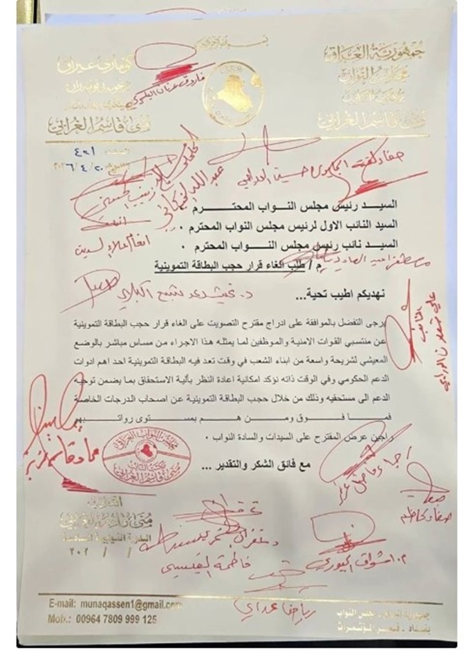 جمع تواقيع نيابية لإلغاء حجب البطاقة التموينية عن منتسبي القوات الأمنية والموظفين