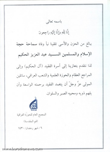 كل نفس ذائقة الموت، ولو كان هناك استثناء من الموت لاستثني حبيب إله العالمين المصطفى محمد(ص)، ونحن بدورنا نعزي آل الحكيم هذه الاسرة العريقة والمجاهدة بوفاة بقية السيد محسن الحكيم إنا لله وإنا إليه راجعون