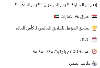 يلتقي منتخبا العراق والإمارات مساء اليوم الثلاثاء في مباراة مصيرية مرتقبة ضمن منافسات التصفيات الآسيوية المؤهلة إلى الملحق العالمي المؤهل لـ كأس العالم 2026.