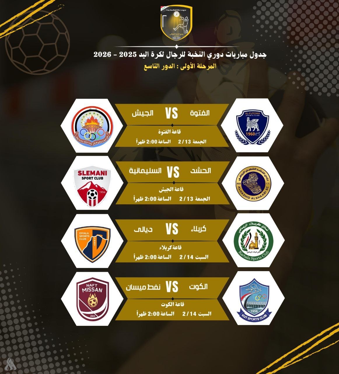 أعلنت لجنة المسابقات في الاتحاد العراقي لكرة اليد ، جدول مباريات الدورين الثامن والتاسع من المرحلة الأولى لدوري النخبة للموسم 2025–2026، حيث حددت اللجنة يومي الجمعة والسبت المقبلين موعداً لانطلاق المباريات، وذلك بعد توقف منافسات الدوري بسبب مشاركة منتخبنا الوطني في البطولة الآسيوية، وعضو الاتحاد العراقي والمشرف على لجنة المسابقات، رعد رمضان، في بيان، إن "الدوري سيعاود نشاطه وفق المنهاج الذي أعدّته لجنة المسابقات في وقت سابق".
