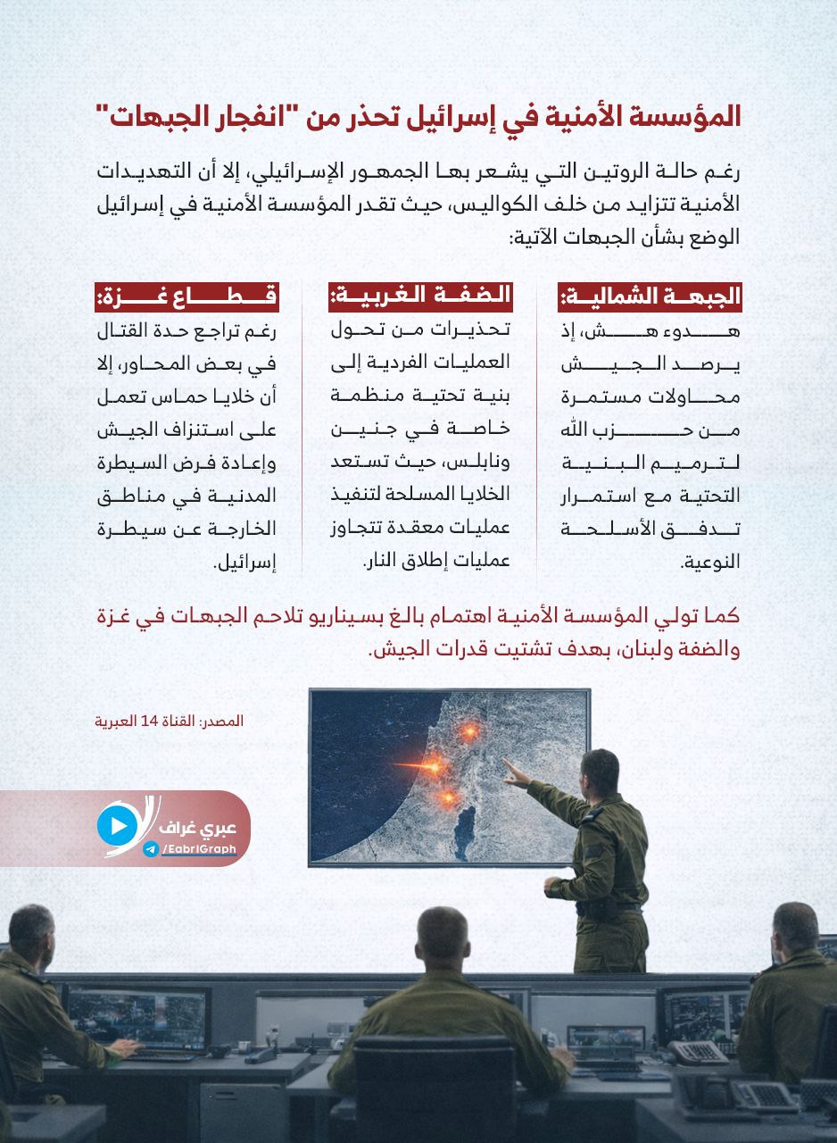 القناة 14 العبرية | المؤسسة الأمنية في إسرائيل تحذر من "انفجار الجبهات"