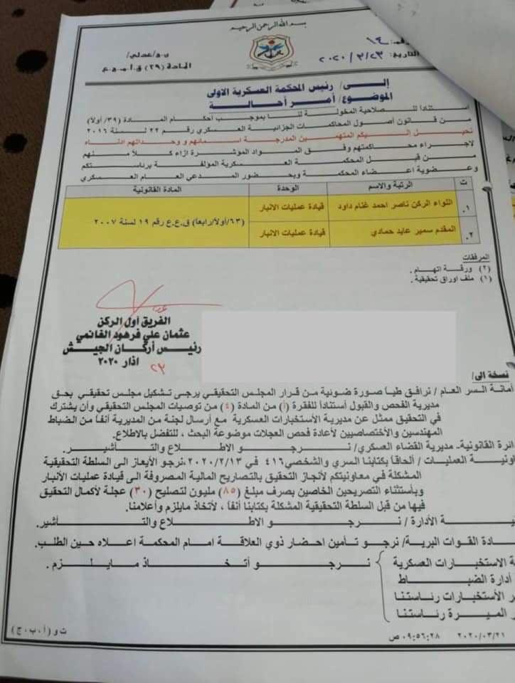 صدرت وثيقة من رئيس اركان الجيش عثمان الغانمي تتضمن احالة قائد عمليات الانبار وضابط اخر بالقيادة الى المحكمة العسكرية.