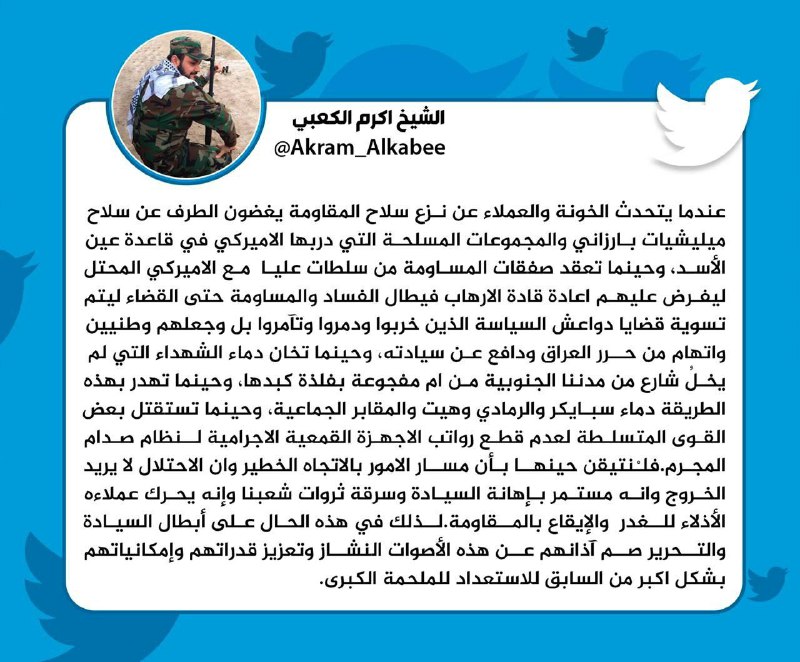وقال الكعبي في تغريدة على تويتر إنه “عندما يتحدث الخونة والعملاء عن نزع سلاح المقاومة يغضون الطرف عن سلاح ميليشيات بارزاني والمجموعات المسلحة التي دربها الاميركي في قاعدة عين الأسد، وحينما تعقد صفقات المساومة من سلطات عليا مع الاميركي المحتل ليفرض عليهم اعادة قادة الارهاب فيطال الفساد والمساومة حتى القضاء ليتم تسوية قضايا دواعش السياسة الذين خربوا ودمروا وتآمروا بل وجعلهم وطنيين واتهام من حرر العراق ودافع عن سيادته”.