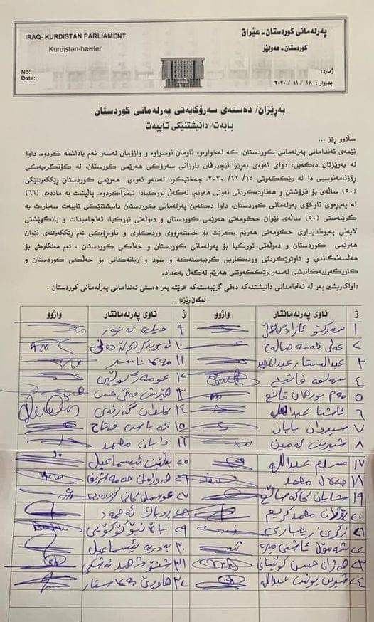 تقدم 32 نائباً في برلمان إقليم كردستان بطلب رسمي إلى رئاسة البرلمان من أجل استضافة رئيس الحكومة مسرور بارزاني، لغرض الإطلاع على الاتفاقية المبرمة مع تركيا.