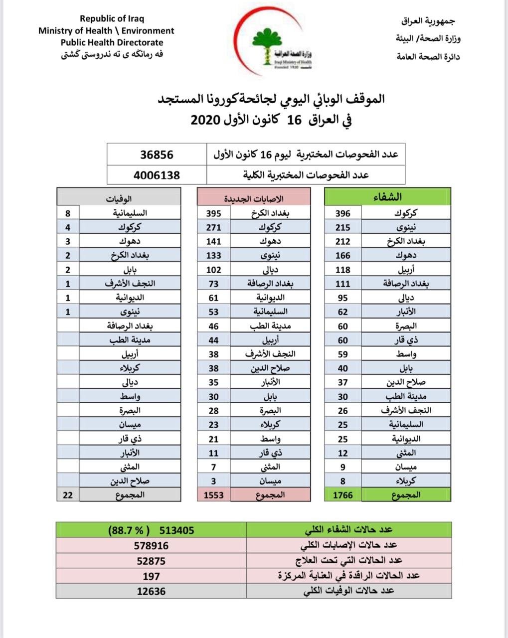 اعلنت وزارة الصحة، عن الموقف الوبائي لـ، اليوم الاربعاء، فيما اشارت الى تسجل 1553 إصابة جديدة بفيروس كورونا و1766 حالة شفاء، مشيرة الى تسجل 22 حالة وفاة جديدة بالفيروس.