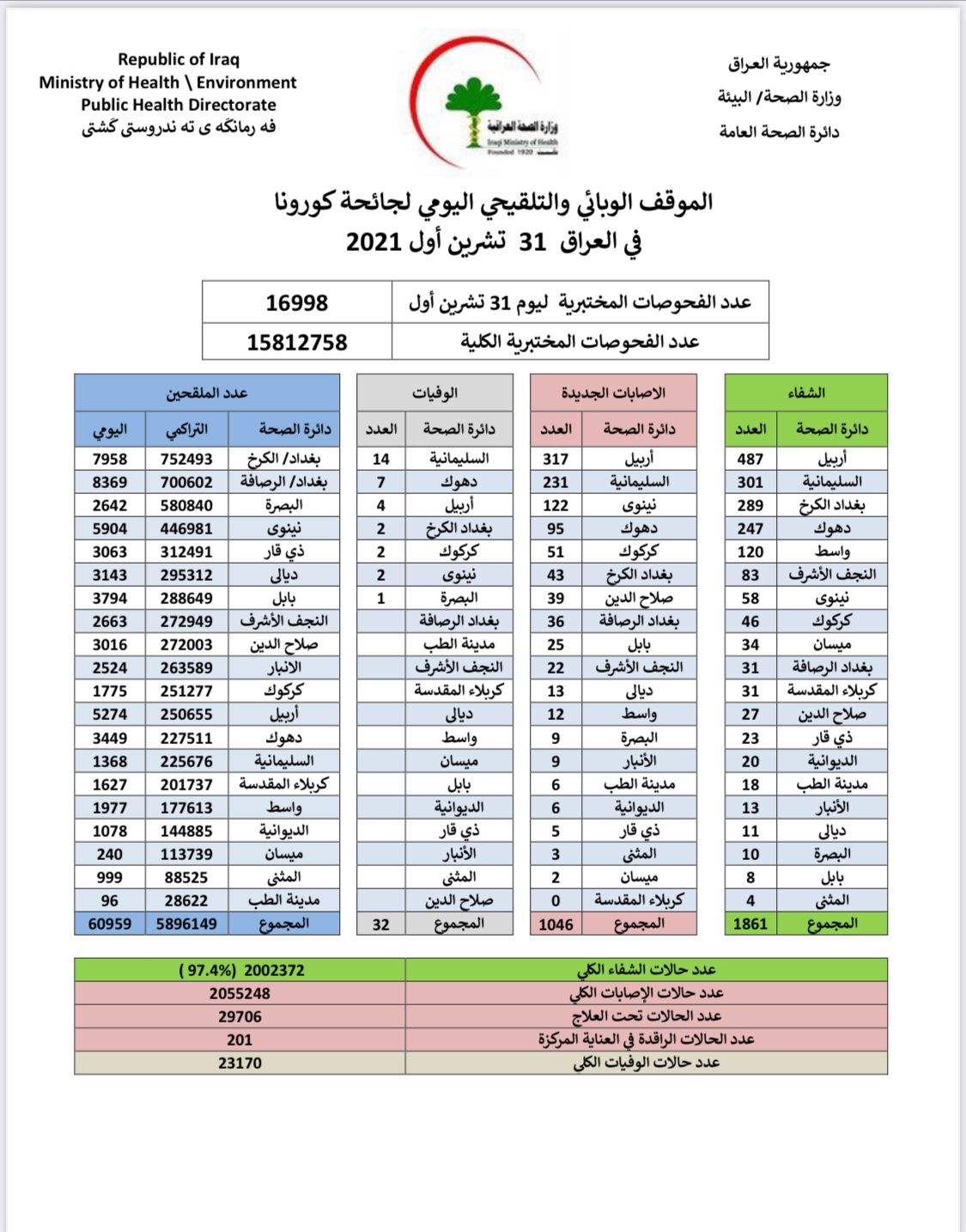 وقالت الوزارة في بيان إن "كوادرها سجلت 1046 إصابة جديدة، مقابل تماثل 1861 حالة شفاء، وتسجيل 32 حالة وفاة بالفيروس".