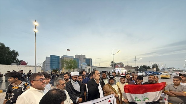 تظاهر عدد من المواطنين في محافظة البصرة، اليوم السبت، قرب القنصلية الكويتية في شارع الكورنيش، وسط المحافظة، نصرة لخور عبد الله.