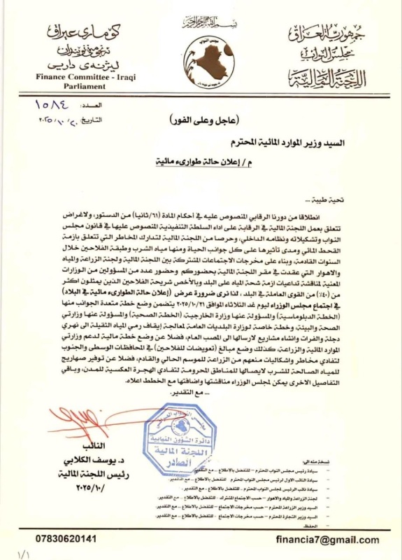 النواب وتشكيلاته ونظامه الداخلي، وحرصا من اللجنة المالية لتدارك المخاطر التي تتعلق بأزمة القحط المائي ومدى تأثيرها على كل جوانب الحياة ومنها مياه الشرب وطبقة الفلاحين خلال السنوات القادمة، وبناء على مخرجات الاجتماعات المشتركة بين اللجنة المالية ولجنة الزراعة والمياه والاهوار التي عقدت في مقر اللجنة المالية بحضوركم وحضور عدد من المسؤولين من الوزارات المعنية لمناقشة تداعيات أزمة شحة المياه على البلد وبالأخص شريحة الفلاحين الذين يمثلون اكثر من 40 بالمئة من القوى العاملة في البلد، نرى ضرورة عرض إعلان حالة الطوارىء مائية في البلاد )في اجتماع مجلس الوزراء ليوم غد الثلاثاء الموافق 21 تشؤرين الأول 2025، يتضمن وضع خطة متعدة الجوانب منها الخطة الدبلوماسية والمسؤولة عنها وزارة الخارجية ( الخطة الصحية) والمسؤولة عنها وزارتي الصحة والبيئة، وخطة خاصة لوزارة البلديات العامة لمعالجة إيقاف رمي المياه الثقيلة الى نهري دجلة والفرات وانشاء مشاريع لارسالها الى المصب العام، فضلا عن وضع خطة مالية لدعم وزارتي الموارد المائية والزراعة".