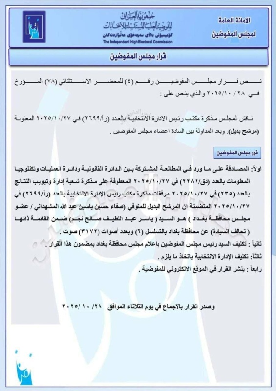 أدناه نص الوثيقة الصادرة عن مفوضية الانتخابات بتاريخ (28 تشرين الاول 2025)،
