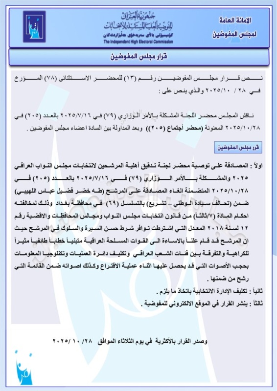 وبحسب وثيقة ، اليوم الأربعاء (29 تشرين الأول 2025)، فإن المفوضية قررت استبعاد المرشح طه اللهيبي من المشاركة في الانتخابات بسبب قيامه علناً بالاساءة الى القوات المسلحة العراقية متبنياً خطاباً طائفياً مثيراً للكراهية والتفرقة بين فئات الشعب العراقي.