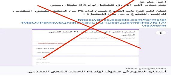 نفت هيئة الحشد الشعبي الانباء المتداولة بشأن فتح باب التطوع في "اللواء 34"، مؤكدة ان هذه الاخبار كاذبة ومزيفة، وتُروَّج لاغراض مختلفة.
