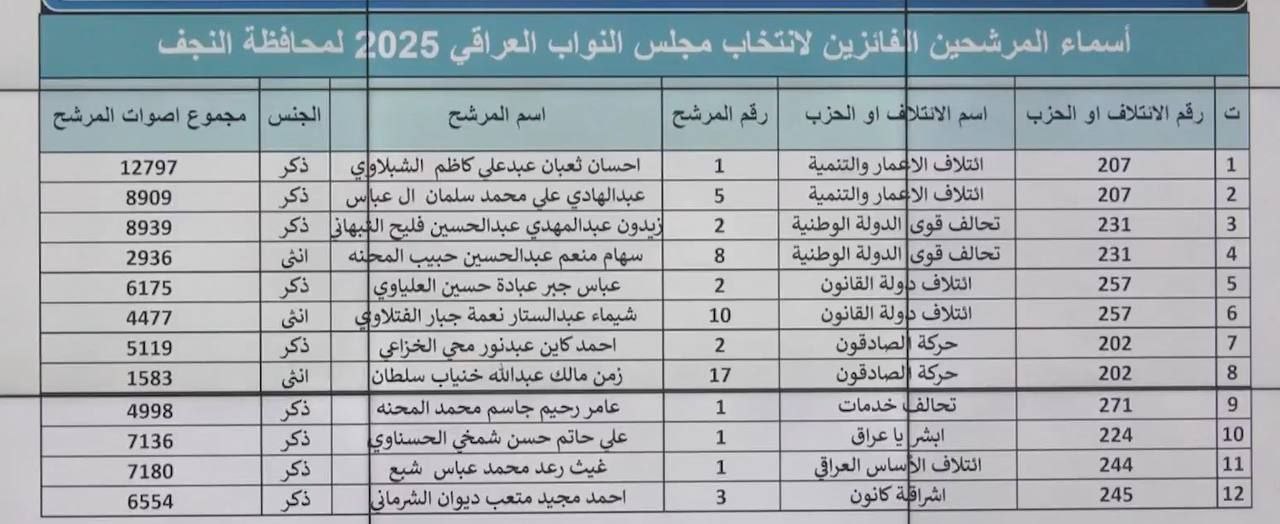 اسماء الفائزين في الانتخابات البرلمانية يمحافظة النجف الأشرف