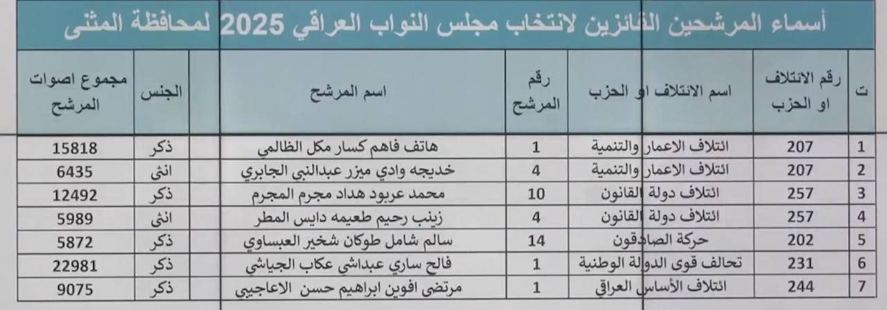 اسماء الفائزين في الانتخابات البرلمانية يمحافظة المثنى