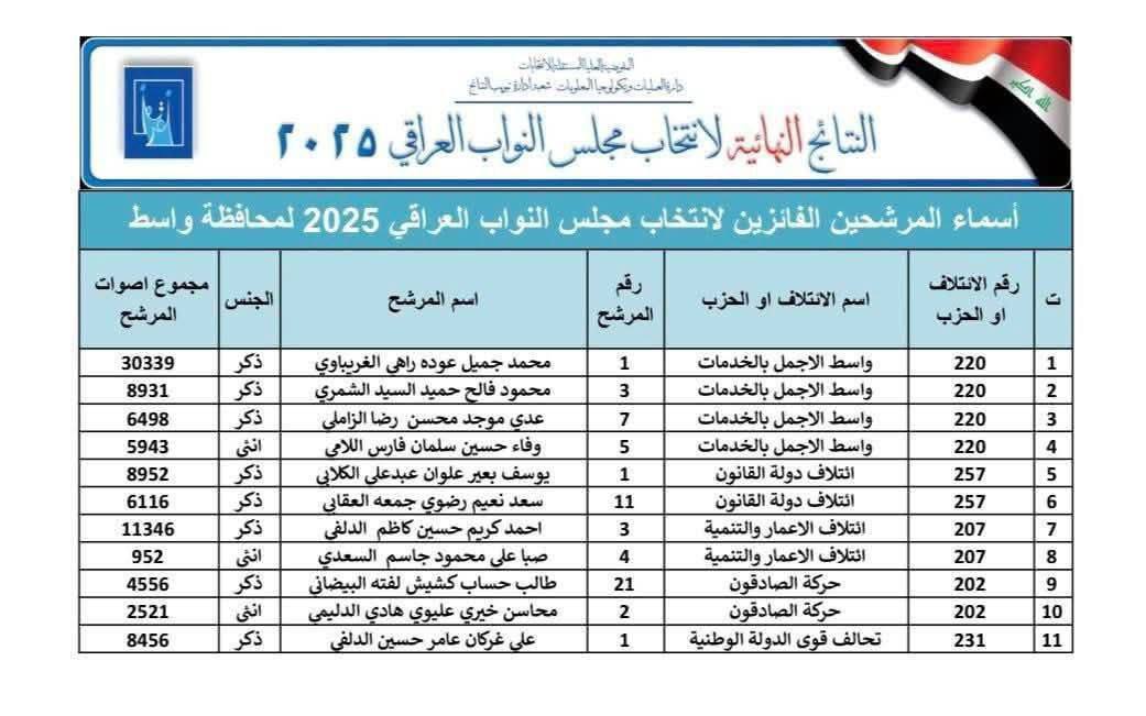 اسماء الفائزين في الانتخابات البرلمانية بمحافظة واسط