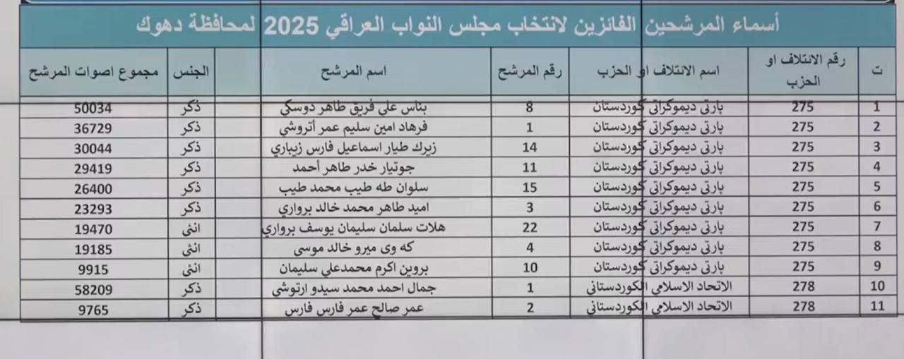 اسماء الفائزين في الانتخابات البرلمانية بمحافظة دهوك