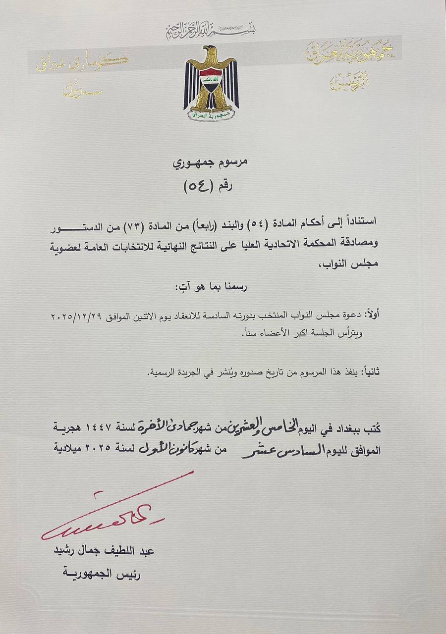 وجاء في المرسوم الجمهوري الصادر اليوم انه "استناداً إلى أحكام المادة (54) والبند (رابعاً) من المادة (73) من الدسـتور ومصادقة المحكمة الاتحادية العليا على النتائج النهائية للانتخابات العامة لعضوية مجلس النواب، رسمنا بما هو آت: