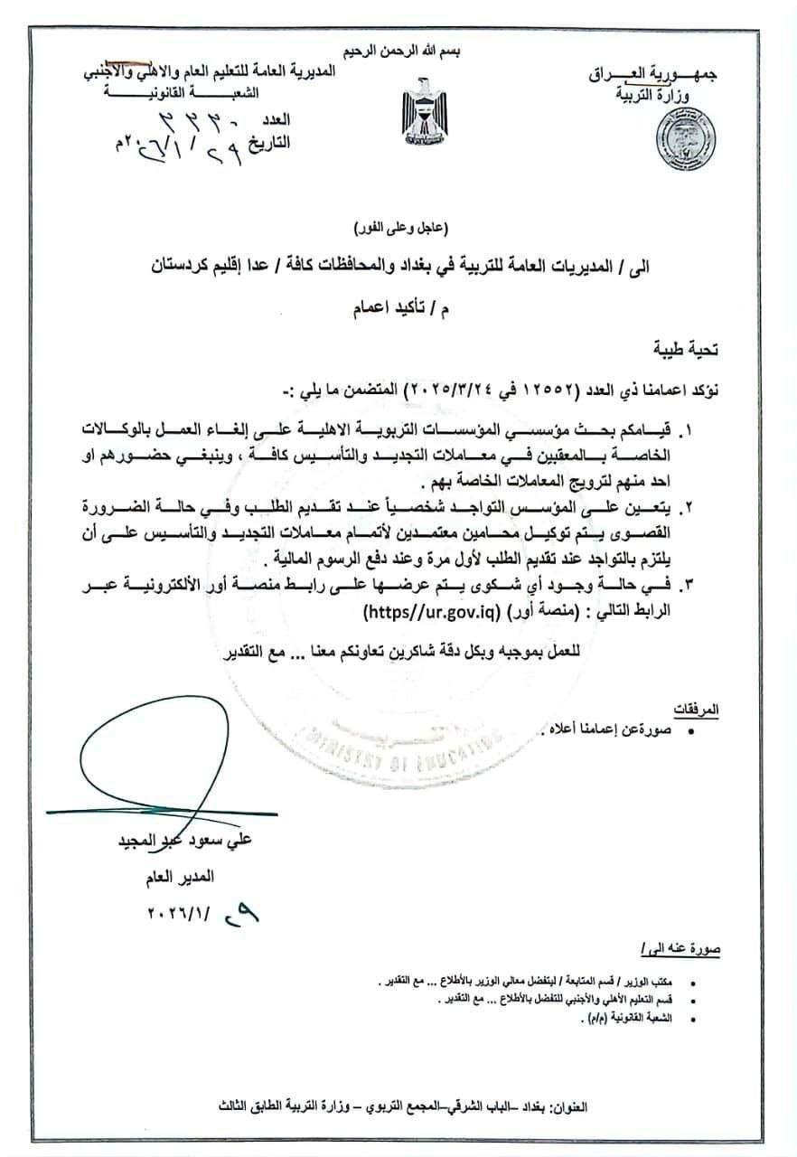 وزارة التربية توجّه بإلغاء الوكالات الخاصة في المعاملات التربوية.