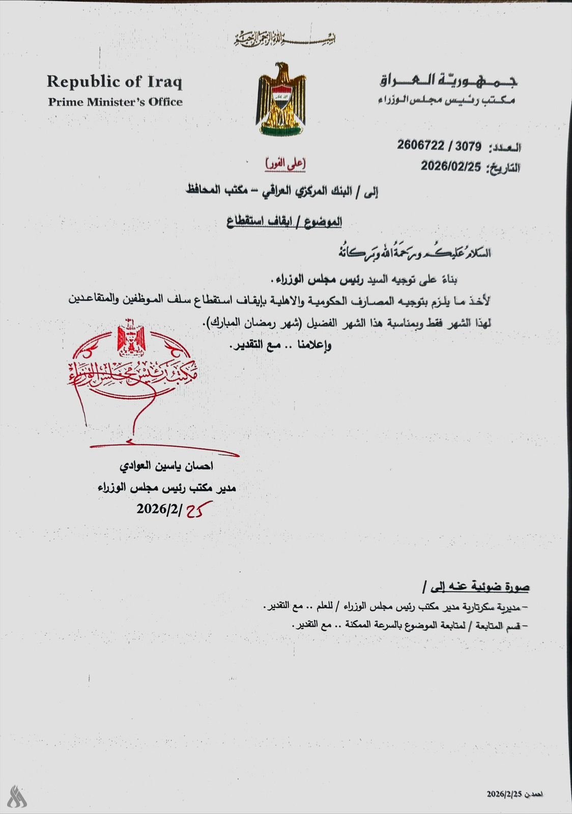 رئيس الوزراء يوجه المصارف بإيقاف استقطاع سلف الموظفين والمتقاعدين للشهر الحالي