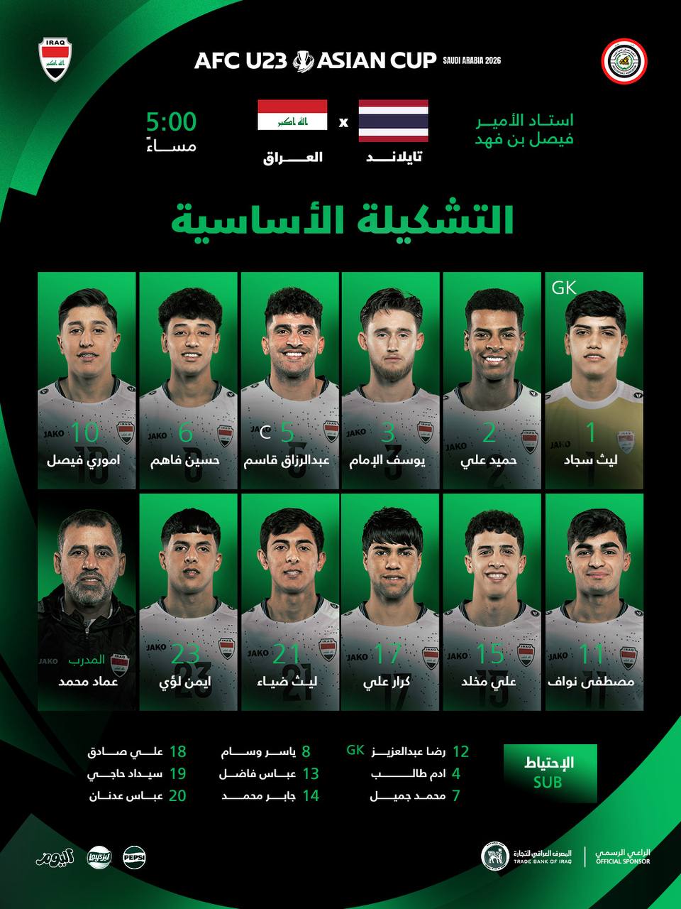 نسرت تشكيلة منتخبنا الأولمبيُّ لمواجهةِ نظيره التايلاندي في المباراة التي تجري اليوم الاحد ضمن الجولة الثانية من نهائيات كأس آسيا تحت 23 عاماً.